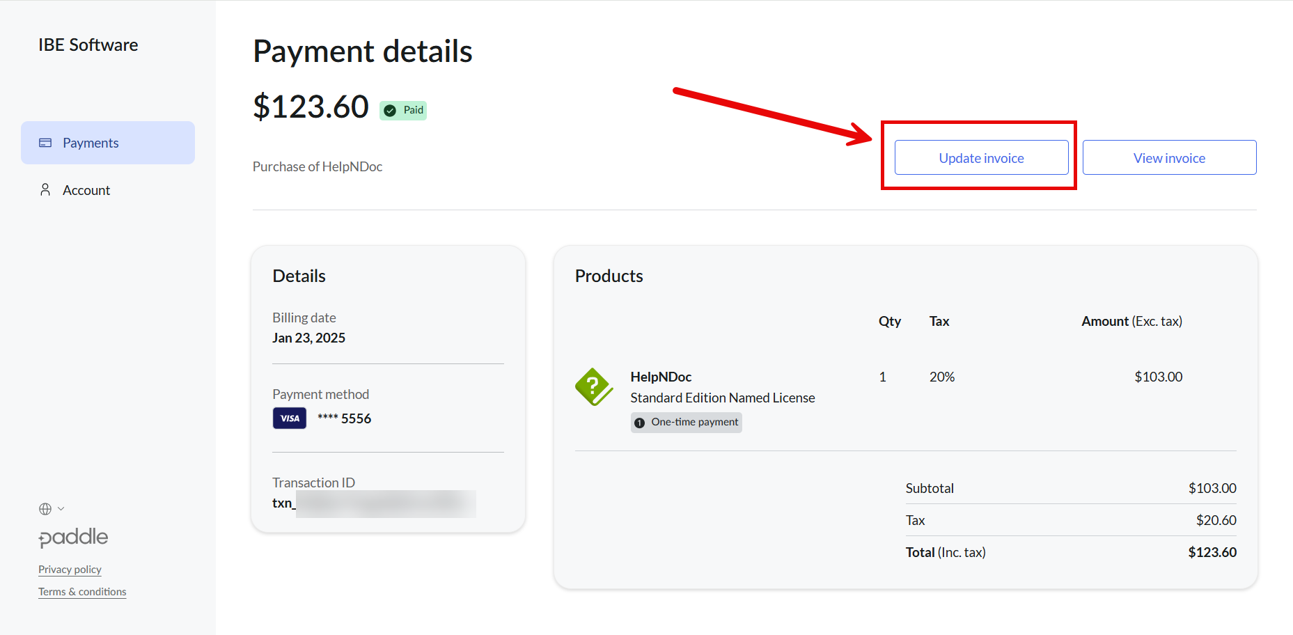 Sur cette page, cliquez sur le bouton Update invoice.